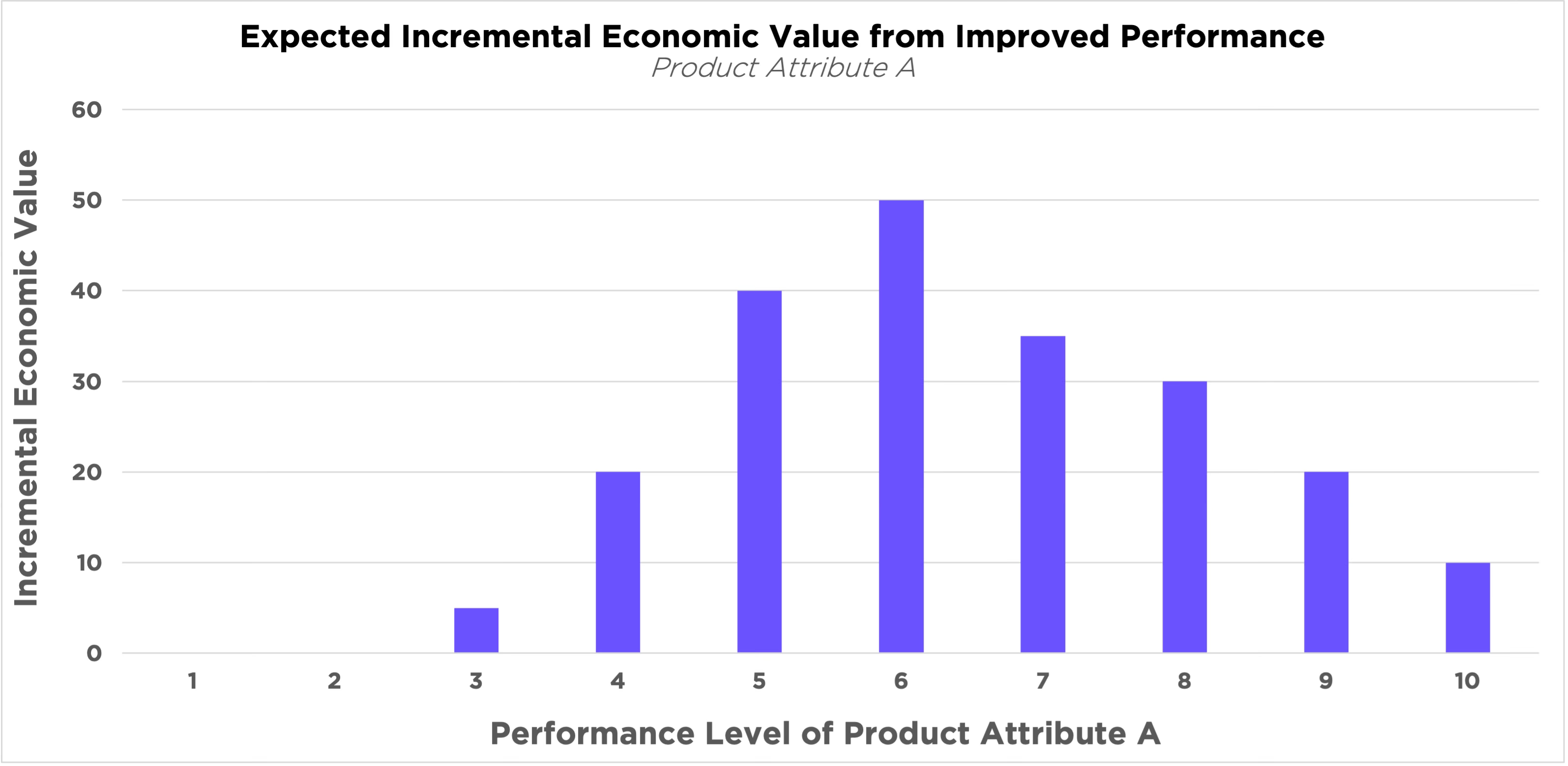 The X-axis shows the absolute performance along a specific product/service dimension. For example, if this were an Electric Vehicle, this dimension might be Operating Range (distance in miles or kilometers would replace the generic values). The Y-axis shows the expected incremental economic value (IVA) created by improving performance along this dimension (values in the appropriate currency would replace the generic values).