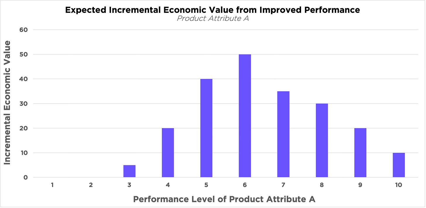 If the example above were for a new product, any performance below 4 along this dimension would limit market adoption. Thus, a performance value of 4 might be what some term “table stakes” in this market.